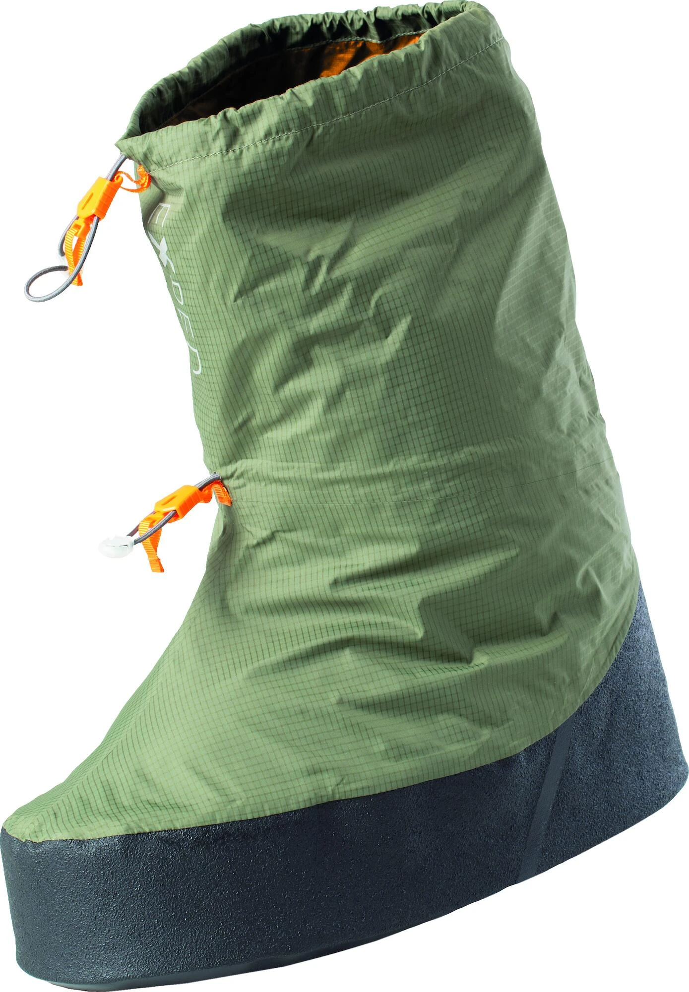 Der Bivy Booty ist der ultimative, wasserdichte Überbooty für das Basecamp. Er lässt sich ideal mit den EXPED Camp Booties, Down Socks oder Camp Slippers kombinieren. Die 1 cm dicke, rutschfeste, hochgezogene Sohle aus rezykliertem Material und der spezielle Fersenschutz schützen und isolieren perfekt. Durch die elastischen Kordelzüge lässt sich der Bivy Booty perfekt am Fuss fixieren. Die Bänder können auch mit Handschuhen oder einhändig bedient werden. Das nahtbandverschweisste, PFC-freie Aussenmaterial ist dampfdurchlässig und schützt mit einer Wassersäule von 10’000 mm vor Nässe und Feuchtigkeit.