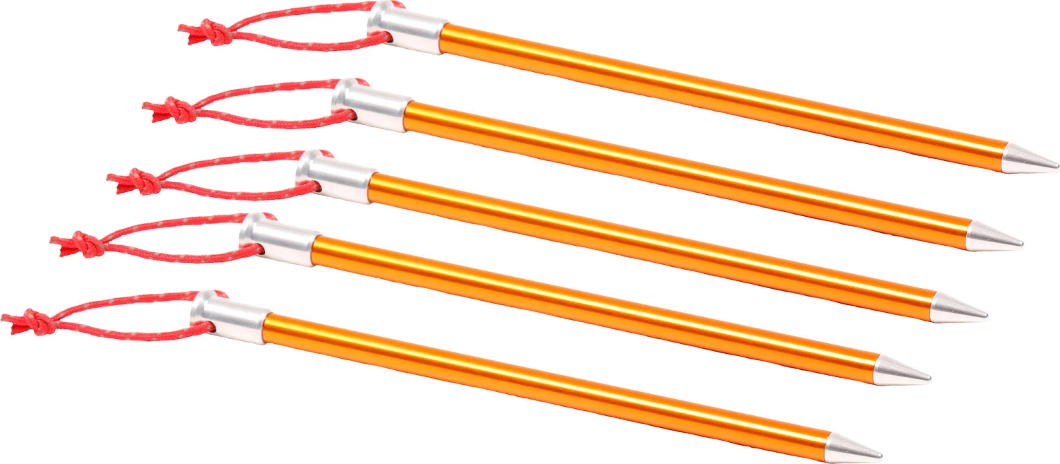 Die stabilen, nagelförmigen Zeltheringen bestehen aus eloxiertem Aluminium. Sie sind ideal für feste Böden geeignet. Die am Kopf angebrachte Schlaufe erleichtert das Herausziehen aus dem Boden.