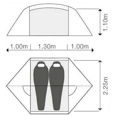 Getragen wird die windstabile und wetterfeste Konstruktion von einem DAC Featherlite NSL TH72M Gestänge in den Stärken 9,6 mm und 10,25 mm. So kommt das Trekkingzelt auf ein Gesamtgewicht von lediglich 3,2 kg und kann auf ein Format von 46 x 14 cm gepackt werden. So lässt sich das 2-Personen Zelt bestens am Trekkingrucksack oder am Gepäckträger befestigen und transportieren. Das Exped Zelt bietet Wanderern und Radfahrern eine Liegefläche im Format 220 x 130 cm. Jeweils ein Meter Apsis schließt sich daran auf jeder Seite an. So können Gepäck und Schuhe optimal verstaut werden.